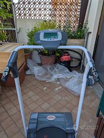 CARATTERISTICHE: pieghevole salva-spazio sta facilmente dietro una porta, marca High Power, anno 2014, in metallo, 3 livelli di inclinazione manuale (massima 15%), modalità controllo tensione da 1(poca fatica) a 8(molta fatica), velocità massima 16 Km/h; schermo Lcd pieghevole con tempo, Km. percorsi e calorie bruciate, manubri cardio Pulse per misurare i battiti visibili su schermo; !! adatto a persone non oltre i 110 KG!!