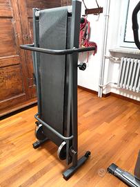 Si tratta di un tappeto professionale - da palestra - azionato dalla sola forza muscolare. La pendenza è fissa ma un apposito congegno, alleggerisce o rende più arduo avanzare come nella camminata in montagna quando si affrontano pendii più o meno ripidi. È quindi un attrezzo particolarmente adatto per la preparazione atletica al trekking ma anche versatile per il fitness domestico. Ci si può camminare più o meno velocemente e fluidamente, correre, salire e scendere ed eseguire una varietà di esercizi. La presa alla maniglia consente la massima stabilità e sicurezza. Per scoprire le potenzialità, suggerisco di visionare qualche lezione disponibile on line di walking. Da chiuso, l'attrezzo occupa poco spazio, decisamente meno rispetto ai tapis a motore elettrico. È dotato di rotelle per lo spostamento. La manutenzione annuale si esegue spruzzando del silicone puro, non colla, spray sotto il tappeto per evitare che la camminata diventi dura. È quindi un attrezzo economico, affrancato dall'elettricità, indistruttibile perché solido e senza elettronica, offre la massima semplicità di utilizzo valorizzando uno degli esercizi più salubri: la camminata ma con il vantaggio di poterlo fare anche guardando la TV.