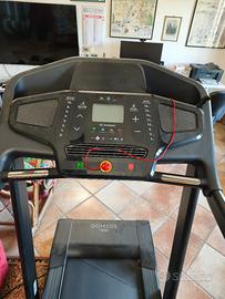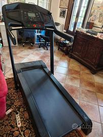 Vendo tapis roulant marca Domyos, modello T900C, acquistato alla Decathlon (pagato 700 euro), con sistema di collegamento bluetooth. pedana larga e ammortizzante. Dimensioni in cm (aperto): lunghezza 185, larghezza 88, altezza 147cm. Dimensioni in cm (chiuso): lunghezza 133, larghezza 88, altezza 150. Attrezzo solido, stabile e silenzioso, ideale sia per camminata che per corsa, con regolazione velocità e inclinazione, con diversi programmi preimpostati e display per monitorare i principali parametri. Corredato di manuale d’uso , fascia cardio e lubrificante per il nastro (ancora da aprire). Attrezzo richiudibile e con ruote per lo spostamento. Mai utilizzato, prodotto pari al nuovo ed in condizioni perfette.