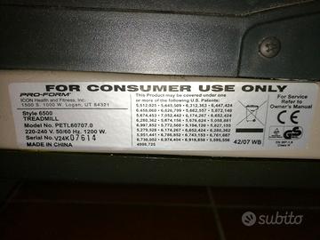 Tapis-roulant PRO FORM Style 6500 modello PETL60707.0 perfettamente funzionante, comprato da Decathlon, corda bracciale per stop di sicurezza, velocità fino a 16 km/h, pendenza regolabile da pulsante da 1 a 10, pedana pieghevole, vari programmi workout, rilevazione frequenza cardiaca, apertura pedana accompagnata da ammortizzatore. Modello molto solido e potente. Ritiro a Varese città.