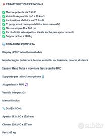 Vendo, con dispiacere, dopo un periodo di limitato utilizzo riabilitativo, tapis roulant professionale hp hi- performance Carnielli pagato 1200 euro . Il suo utilizzo è avvenuto solo in casa lontano da umidità, giardini o luoghi promiscui; eccellenti condizioni con tappeto in perfette condizioni (solo usato spray originale per scorrevolezza tappeto per la necessaria manutenzione) Software per utilizzo Wi-Fi, collegamento con tutte le applicazioni , personalizzazione su piu' utilizzatori, misurazione del battito cardiaco tramite le manopole, angolazione del tappeto elettrico (anche in esecuzione di programma), velocità, calcolo calorie consumate (scheda tecnica all.ta completa). prezzo, se interessati seriamente, trattabile