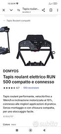 Tapis Roulant Nuovo, ancora con pellicola display, acquistato il 10 dicembre 2024, scheda tecnica sul sito Decathlon, pagato € 699,99, velocità fino a 16 km/h, inclinazione motorizzata al 10 % , programmi personalizzabili tramite App, chiusura salvaspazio, etc....Non si fornisce numero telefonico se non previa verifica del reale interesse.