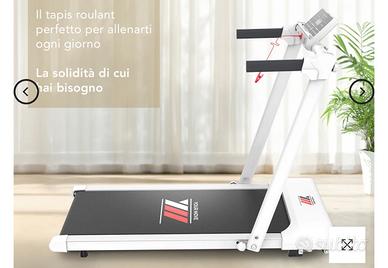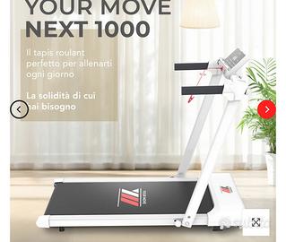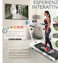 VENDO TAPIS ROULANT COLORW BIANCO PIEGHEVOLE E LEGGERO PER INUTILIZZO DIMENSIONI E PESO Dimensioni aperto: cm 126x60x116 cm Dimensioni chiuso: cm 145x61x16 cm (solo 16 cm di spessore da chiuso) Dimensioni tappeto corsa: 103 x 42 cm Peso prodotto: 23,5 kg PRATICO E COMPATTO Estremamente robusto grazie al telaio rinforzato, ma anche compatto, leggero e facile da spostare e riporre grazie alle ruote integrate. L’apertura a libro con un angolo di 110 gradi permette di aprire il tapis roulant e ripiegarlo senza fatica. Occupa solo 16 cm di spessore da chiuso, è perfetto per essere nascosto agevolmente negli spazi più stretti di casa, sotto al divano, sotto al letto. Potrai estrarlo all’occorrenza e riporlo agilmente alla fine di ogni allenamento. ALLENATI ONLINE Grazie al Bluetooth integrato collegarsi ai tuoi dispositivi non è mai stato così semplice! Scegli tra le APP di allenamento interattivo Kinomap, Zwift, e molte altre (scaricabili su Google Play e App Store). Potrai connetterti e associare il tuo allenamento a TV, PC, Smartphone e Tablet. Segui programmi di allenamento personalizzati e inizia a percorrere gli itinerari più belli del mondo. Il display con pulsanti interattivi permette di regolare la velocità, il tempo e la distanza desiderate, oppure, di cimentarti in uno dei 12 programmi di allenamento selezionati apposta per te. Dotato di comodissimo appoggio per Tablet e Smartphone. COMFORT E SICUREZZA Pensato per passeggiate e corse leggere, YM NEXT 1000 è accessoriato di un pannello multistrato, ideale per assorbire gli urti e rendere più confortevole la falcata. Il nastro rivestito in trama PRO-GRIP permette una aderenza sicura. Superfice di corsa MAXI: 103 x 42 cm. Le impugnature con morbido rivestimento in EVA garantiscono una presa confortevole e un appoggio ottimale nelle lunghe passeggiate, per sentire meno la fatica e mantenere l’equilibrio al meglio.