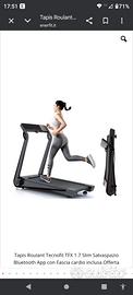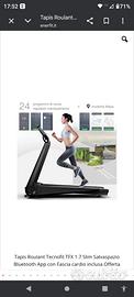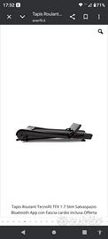 Tapis Roulant Tecnofit TFX 1.7 Slim Salvaspazio Bluetooth App Questo tapis roulant ultra sottile si chiude in soli 30cm facilmente grazie a maniglioni posti sui lati . Operazione facilissima e velocissima richiudere questo tapis roulant salvaspazio Super ammortizzato con elastometri e sistema cushion air ,brevetto tecnofit rubbertech diminuisce lo stress di carico del 50% sulle articolazioni rispetto la corsa su strada Nastro di corsa di 42 cm x 115 cm per facilitarne l'uso in corsa Inclinazione preimpostata Nastro ortopedico da 1,8 mm Potente motore da 2.5 hp Cuscinetti rulli alta qualità display illuminato a 5 finestre led visualizza :velocità,tempo,distanza,calorie e battito cardiaco. Le foto dove è rappresentato un tablet sono solo dimostrative per come si presenta usando un vostro tablet Bluetooth per poter collegare il vostro tapis roulant al vostro tablet o smart phone android o apple App scaricabile per avere programmi infiniti Tablet non incluso nella confezione Si apre e si chiude molto facilmente Il tapis roulant è dotato di autolubrificazione.