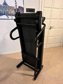 Tapis roulant Treadmill professionale, elettrico, pieghevole e con diverse possibilità di corsa o camminata in salita. Il tappeto misura 37 x 114. L’ingombro totale steso é 64 x 143. Chiuso diventa profondo 57 ed è alto 143. Con ruote per spostarlo. Ritiro solo a mano