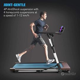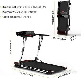 Tapis Roulant pieghevole con telaio in lega di alluminio e finitura in venatura di legno. Facile da piegare e spostase grazie alle rotelle incorporate.