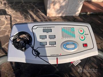 tapis roulant, caratteristiche principali: Display digitali per tempo, velocità, distanza, calorie e pulsazioni. Pulsanti per la regolazione della velocità, la modalità, il reset e l'accensione. Un grafico delle zone di allenamento della frequenza cardiaca basato sull'età. Un'area dedicata per l'inserimento della chiave di sicurezza.