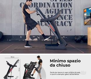 Soft-Touch e multistrato (massimo comfort di corsa e sicuro per le articolazioni). Motore PowerDriveTM, potente, silenzioso ed efficiente per un maggior risparmio energetico con Potenza Massima di Picco: 7 HP – Potenza nominale: 2.5 HP. Include supporto per Tablet, Smartphone, Ipad, Iphone e Chiave di sicurezza per una corsa sicura. Display multifunzione digitale LCD con tasti di scelta rapida per velocità e inclinazione. Pannello di corsa multistrato ammortizzato in 8 punti. Apertura servoassistita 'soft drop' con cilindro idraulico – Pieghevole e salvaspazio con ‘Easy Lift’ per un minore ingombro da chiuso, Facile da movimentare grazie alle ruote integrate