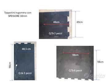 Vendo Tappetino fitness puzzle in gomma antiscivolo, fonoassorbente, antiurto. Il tappetino è di 3 misure per un totale di 10 pezzi dallo spessore di 1 cm.