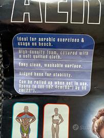 Tappetino fitness con cuscino gonfiabile. Adatto a ambienti chiusi e all'aperto tipo in spiaggia perché non assorbe la sabbia. Adatto ad esercizi sportivi/aerobici. Materiale: schiuma ad alta densità ricoperta da un morbido panno trapuntato. Superficie facile da pulire e lavabile. Base rigata per stabilità. Può essere arrotolato quando non si usa e facilmente trasportabile a tracolla avendo la predisposizione all'uso. Cuscino gonfiabile. MISURE: Lunghezza 152cm Larghezza 57cm. NUOVO MAI USATO.