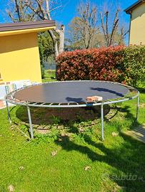 Tappeto elastico di circa 3 metri di diametro. Le foto sono della parte inferiore. C'è anche la parte superiore con pali di sostegno e rete di protezione. Manca solo il tappetino circolare in gommapiuma che copre le molle. Il prodotto è tedesco. Il tappeto è in buone condizioni: devono soltanto essere pulite alcune molle da ruggine superficiale. La bulloneria c'è tutta anche se forse è opportuno sostituire alcune viti di facile reperibilità.