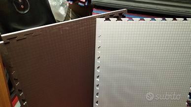 Tatami a incastro reversibile completo di 2 cornici perimetrale, misura 100x100cm spessore 3cm colore marrone/grigio a incastro reversibile versione TOP di gamma multi densità con strato anti shock, superfice esterne colorate in EVA densità 120kgm3, strato centrale in polietilene densità 40kgm3 per ammortizzare per evitare il rimbalzo della caduta.