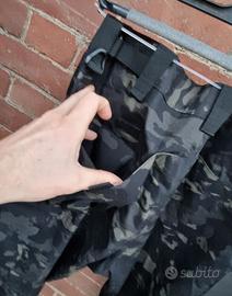 Pantaloni tattici mimetici nuovi, taglia xl (52), in tessuto antistrappo tipo rip-stop ottimo per la traspirabilità e resistenza, non sono impermeabili ma asciugano in fretta, non sono imbottiti quindi utilizzabili al freddo con intimo temico, eccellenti quando fa caldo; ottimi per attività tipo poligono, softair, escursionismo. Numerose tasche circa 12 tra cui la cargo a sinistra con alloggiamenti porta caricatori vedi foto anelli triangolari per moschettoni, due strap in velcro per regolazione vita oltre i passanti per cintura. Lunghezza da vita a caviglia 106cm. Larghezza vita 48/54 a seconda della regolazione dei velcri. Salewa,salomon,Columbia,trabaldo,nike adidas.