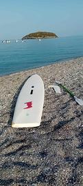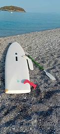 Vendesi tavola da windsurf Olimpic Surf versatile multiuso utilizzabile come canoa con pagaia (nella foto) oppure per fare tavola da SUP anche per surf applicando nuovo giunto per albero. E’ realizzata con anima in polistirolo lunga cm 390 larga cm 70 spessa cm 14 per un peso fino a 2 passeggeri fino a Kg 190. Ottimo galleggiamento. E’ compreso una pinne di coda e la deriva centrale oltre alla pagaia in foto. Viene dato in dotazione kit di riparazione resina epossidica E227 e relativo indurente per tavole e imbarcazioni. Già utilizzato sulla tavola in vendita per una riparazione all’estremità in coda come nella foto con risultati eccellenti. Da ritirare sul posto Cosenza città non spedibile per le dimensioni.