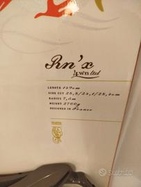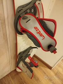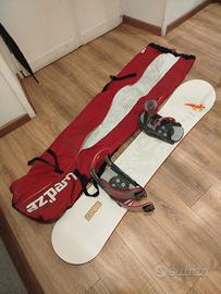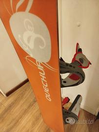tavola adatta per principianti può essere utilizzata per fare freestyle o all-mountain è un prodotto datato in quanto Quechua non produce più tavole, è in ottime condizioni, non ha graffi, è senza ruggine e ha le lamine intatte. Gli attacchi Wedze sono un prodotto Decathlon e sono adatti per principianti, la plastica è ancora flessibile e sono resistenti. Questa attrezzatura è ideale per chi vuole provare senza affrontare spese importanti. Il tutto è un una sacca coordinata Wedze che rende facile il trasporto e che dimostra la cura con cui la tavola è stata conservata. Il prezzo del prodotto finale corrisponde a 2 o 3 giorni di noleggio.