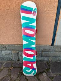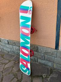 Tavola da snowboard Salomon Oh Yeah lunghezza 147 cm, usata due volte di numero, soletta e lamine perfette. Attacchi salomon. Tavola morbida e molto maneggevole, divertente.
