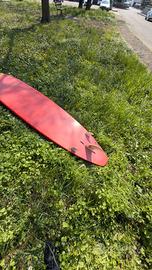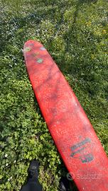 Tavola da surf longboard 10 piedi usata, colore rosso, con pinne montate. Presenta evidenti segni di usura e scolorimento sulla superficie.