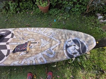 Tavola da windsurf RRD TWINTIP da 100litri con la sua pinna , riparata in carena ,, potrebbe essere utilizzata come primo approccio ad un litraggio del genere ,,, è visto che devo fare spazio la devo togliere ..