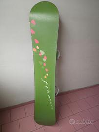 Bellissima Tavola Snowboard da donna Flow Ghost Verde lime Misura 150 cm, usata pochissimo da principiante, con attacchi Flow abbinati in bianco e verde lime. Presenta un design scuro con grafiche a forma di cuore/foglia arancioni e verdi. Gli attacchi sono del tipo a ingresso rapido (rear-entry binding), un marchio di fabbrica di Flow. Gli attacchi, di colore bianco e verde lime, utilizzano un highback reclinabile che consente al boot di scivolare dentro e fuori facilmente. Questo tipo di attrezzatura è apprezzato per la sua comodità e velocità di utilizzo in montagna.
