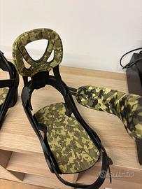 Colore nero con dettagli verde militare/camouflage. Struttura solida e confortevole, con strap anteriori e posteriori regolabili. Compatibili con la maggior parte delle tavole.