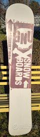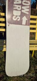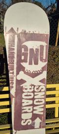 tavola da snowboard, marca GNU, modello CARBON CREDIT, misura 156. Profilo rocker, lamine con sistema Magne-Traction. Presenta una botta in coda che ha rovinato il top ma non arriva al legno per cui non è a rischio la solidità e tenuta della tavola