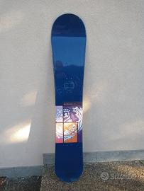 Tavola snowboard lunga 157 cm, twin tip, camber tradizionale.