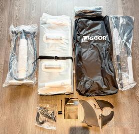 Incluso stand up paddle gonfiabile, zaino, leash di sicurezza, pompa manuale a doppia azione, pagaia in alluminio a doppio uso, 3 pinne, supporto per i piedi, cinghia di trasporto, kit di riparazione, borsa stagna da 5L, custodia impermeabile per telefono, supporto per telefono e manual