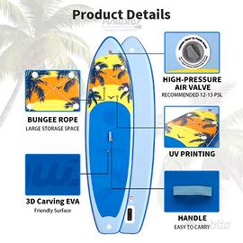 tavola SUP gonfiabile Funwater, perfetta per divertirsi in acqua tra mare, lago o fiume. Ideale sia per principianti che per utenti più esperti grazie alla sua ottima stabilità e facilità di utilizzo. Le dimensioni 335 x 84 x 15 cm offrono un equilibrio perfetto tra stabilità e maneggevolezza. La tavola supporta fino a 170 kg, risultando adatta anche per trasportare uno zaino, bambini o piccoli animali. Realizzata con materiali resistenti e progettata per una pressione fino a 12 PSI, garantisce sicurezza e prestazioni affidabili in ogni situazione. ✔ Caratteristiche principali: Tavola stabile e sicura, perfetta per ogni livello Superficie antiscivolo per massimo grip Ideale per escursioni, relax, yoga e pesca Facile da trasportare grazie allo zaino incluso Anelli a D per fissare oggetti personali ✔ Accessori inclusi: Pagaia in alluminio regolabile Pompa ad alta pressione Leash di sicurezza 1 pinna removibile Zaino da trasporto Kit di riparazione Chiave multifunzione Asta/strap di supporto (utile per spinta o stabilità in acqua) Pronta all’uso: gonfia, monta e goditi subito le tue uscite in acqua. Ottima scelta per sport, relax e avventure estive! Parole chiave: paddleboard, stand up paddle, tavola mare, tavola surf, sport acquatici, gonfiabile mare, kayak alternativo, surf estate, tavola acqua, attività estiva, sport outdoor, mare lago fiume, attrezzatura sportiva, tavola stabile, tavola larga, accessori sup, pagaia regolabile, zaino trasporto, leash sicurezza, pompa inclusa, pinna removibile, sup principianti, sup avanzati, tavola resistente, sup leggero, tavola trasportabile, gonfiabile resistente, tavola multifunzione, yoga acqua, pesca mare, sport estivi, attività all’aperto, relax acqua, tempo libero, vacanze mare, attrezzatura mare, giochi acqua, tavola adulti, tavola professionale, paddle surf, sup completo, kit sup, tavola con accessori, sup blu, tavola lunga, tavola 335 cm, tavola 84 cm, tavola spessa 15 cm, equilibrio acqua, sport fitness acqua