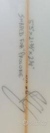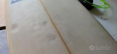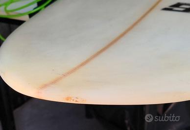 5'9" x 21 7/8" x 2 3/4" (volume stimato circa 38-40 lt) Lo shape presenta un nose largo e un volume generoso distribuito su tutta la linea, facilitando la partenza e il mantenimento della velocità anche su onde poco potenti. La tavola è strutturalmente integra. Presenta i normali segni di utilizzo (pressure dings) sul deck e piccoli segni estetici dovuti all'usura del materiale, come visibile in foto. Non sono presenti riparazioni profonde o infiltrazioni d'acqua. Inclusi: pinne futures, leash e pad gia applicato (tutto visibile in foto) Trattabile se ritirate direttamente in zona