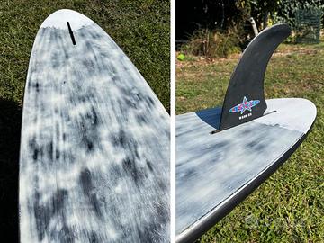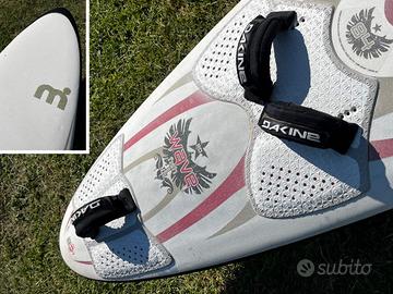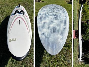 Mistral Wave 84 litri di Volume, 231x59 cm - Coperta con antisdrucciolo in ottime condizioni, completa di STRAPS e 2 pinne wave. Strutturalmente intatta, con riparazione di poco conto, carena rifatta, sulla poppa SOLO stuccatura e verniciatura, SCASSA pinna intatta. PERFETTAMENTE NAVIGANTE e robusta