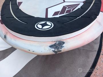 Vera tavola ibrida (freeslalom pinna o foil). Diversi colpi a prua ma tutti riparati per sicurezza e la tavola non ha bevuto (posso mandare foto con pesa). Vendo con sua pinna MCF da 38.