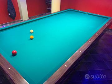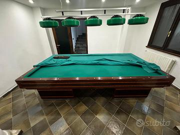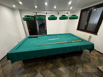 Tavolo biliardo Hartes alla goriziana (senza buche) riscaldato compreso di stecche, palline, birilli , segna punti elettronico e 5 lampade verdi da soffitto come in foto.