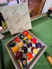 Sono inclusi: 2 stecche, set da 15 palle numerate (di dimensioni proporzionate al biliardo) + pallino bianco, triangolo.