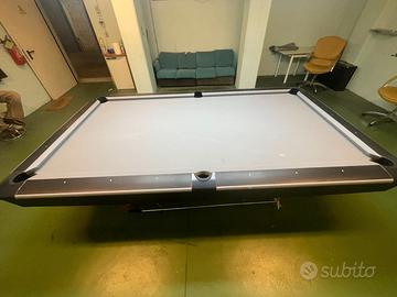 Tavolo biliardo pool 9 piedi OLIO (Dynamic II) in perfetto stato * panno Symonis 860 grigio (gara) * sponde ARTEMIS K55 (un anno di vita) * buche angolo 10,4cm, centrali 11,4cm (come da nuove misure Fisbb) * cestelli buche nuovi * Stopper 5mm * wrap simil carbonio nero e grigio su tutta la struttura superiore * ganci porta-rastrello * portabilie e portatriangolo incassati su sponda di testa