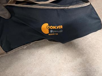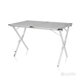 Un tavolo Genius della Con.Ver in alluminio molto leggero con piano arrotolabile. Caratteristiche: - Struttura in alluminio anodizzato con giunti in acciaio zincato - Piano a “tapparella” in alluminio - Piedino regolabile per trovare sempre il piano - Barra di rinforzo - Custodia a doppia zona per dividere struttura e piano, in dotazione - Peso ridotto e montaggio rapidissimo - Dimensioni aperto: 150x80xh72 cm - Dimensioni chiuso: 110x22x17 cm - Peso: 6,65 kg Due sedie pieghevoli Action Equiframe della Brunner. Realizzate con telaio in acciaio verniciato e seduta in resistente tessuto di poliestere. Molto facile da aprire e chiudere. Completa di borsa per il trasporto. Caratteristiche: - Colore grigio/nero - Materiale Acciaio Ø 16 mm - Tessuto: 100% Polyester - Custodia con tracolla per il trasporto - Dimensioni aperto: 50,5x57xH46/77 cm - Dimensioni chiuso: 77x17xH17 cm - Peso: 2,75 kg - Portata: 102 kg No spedizione. Ritiro a Roma, zona Eur