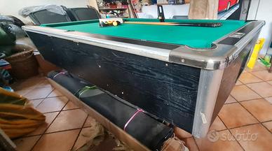 Tavolo da Carambola Usato completo di nr 5 stecche vintage , nr 1 set boccette , nr 1 set boccette da Carambola made in Belgium , gessetti porta stecche da muro nr 2 triangoli. Visto e piaciuto.