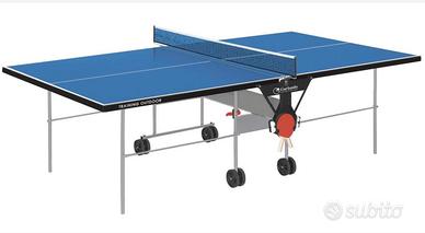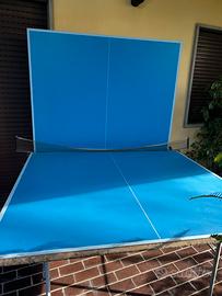 Il piano di gioco in resina melaminica da 4 mm, con finitura blu antiriflesso, garantisce rimbalzi regolari e visibilità ottimale anche alla luce del sole. Il telaio perimetrale in metallo da 36 mm assicura stabilità, mentre le gambe pieghevoli in tubo metallico da 25 mm lo rendono pratico da aprire, chiudere e riporre.