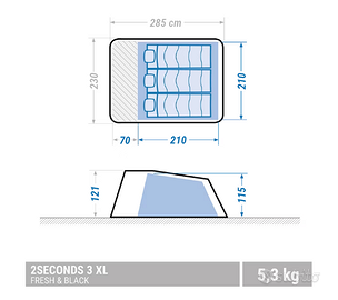 Questa tenda 2 Seconds 3 XL Fresh&Black è una tenda da campeggio automatica pensata per chi cerca comfort e praticità senza rinunciare allo spazio. Grazie al sistema “2 Seconds”, si apre in pochi istanti senza bisogno di montaggio, ideale anche per chi è alle prime armi. La versione XL offre un’abitabilità superiore rispetto alle tende standard per 3 persone, con maggiore altezza e spazio interno, permettendo di muoversi comodamente e sistemare zaini o attrezzatura. La tecnologia Fresh&Black è uno dei suoi punti di forza: riduce notevolmente il calore all’interno durante il giorno e oscura la luce, garantendo un sonno più fresco e buio anche dopo l’alba. È realizzata con materiali resistenti, dotata di buona impermeabilità contro la pioggia e di sistemi di ventilazione per evitare condensa.