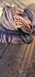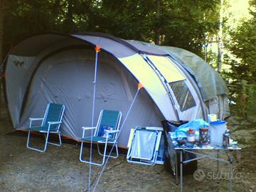Tenda a tunnel da 6 posti,con due camere da letto e una grande spazio per tavolo ect.... Tutte le porte e finestre hanno la zanzariere e anche la bavetta per tenere gli animali meno simpatici... Come si può vede dalle misure si sta bene in piedi. Preferisco non spedire...meglio se vede prima di comprare.....