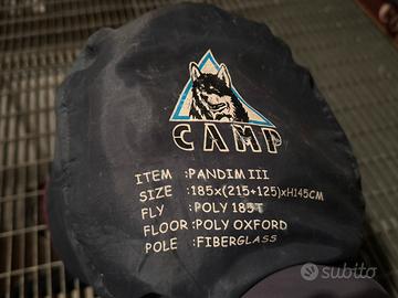 Vendo tenda campeggio Camp Pandim III per tre persone. Con ampio vestibolo per proteggere zaini o bagagli anche in caso di utilizzo in tre persone.