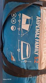 Tenda molto spaziosa comodissima con 2 camere separate fino a 5 persone (3+2). Semplice da montare. UTILIZZATA UNA SOLA VOLTA, COME NUOVA. Modello: QUECHUA ARPENAZ 5.2