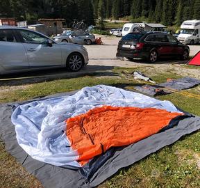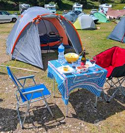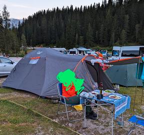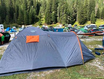Tenda camping Freedom, data per 5 persone, molto comoda per una coppia Tenda a cupola molto spaziosa, dimensioni circa 4x2.5x1.7 metri. È dotata di 3 ingressi: frontale, laterale, posteriore. Camera con due finestre laterali che possono essere tenute aperte con lacci per una migliore ventilazione, reti anti-insetti, tasche porta oggetti. Anticamera per riporre tavolo, sedie, e altro materiale. Picchetti per ancoraggio al terreno.