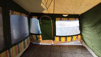 Tenda da campeggio a casetta acquistata nel 1980. Usata poco e solamente durante le vacanze di agosto. Tessuto in cotone con il tetto in pvc e paleria in acciaio zincato che ha un peso totale 35 kg. Ha 2 camere interne con catino in pvc, le tende alle finestra e un palo per appendere i vestiti. Dimensioni in cm: base 370x370 altezza max 190. Presenta un paio di imperfezioni dovuti all'utilizzo.