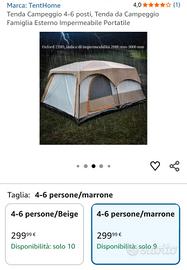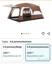 Tenda da campeggio in ottime condizioni, praticamente nuova: utilizzata solo in una occasione per una vacanza di sette giorni. Dotata di due ambienti che possono essere utilizzati entrambi come camere da letto o come camera da letto + soggiorno. Tutte le finestre e l'accesso sono dotate di zanzariere. Dotata di tutti i suoi accessori (borsone, picchetti, lacci di fissaggio), facile da montare, da riporre nel suo borsone e da trasportare. Colori: marrone, bianco, particolari arancioni. Misure e caratteristiche consultabili nelle foto. Possibilità di tutorial per il montaggio (da concordare, perché non ho il giardino), foto reali della tenda (che comunque è quella delle immagini di catalogo allegate all'inserzione) visibili su richiesta Vendo per passaggio ad altra tipologia di tenda. Prezzo leggermente trattabile in caso di spedizione.