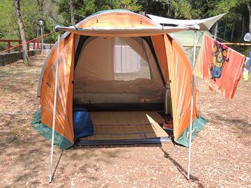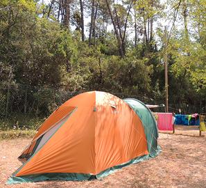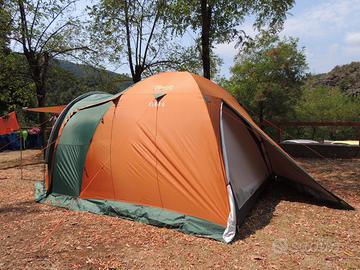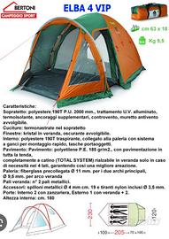 Tenda da campeggio dello storico negozio Bertoni, modello Elba 4 Vip, usata una sola volta. Disponibili altri accessori da campeggio come la prolunga elettrica, il telo protettivo anti umidità da mettere sotto alla tenda, pompa di gonfiaggio elettrica per materassi, cuscini ecc…