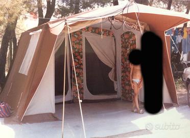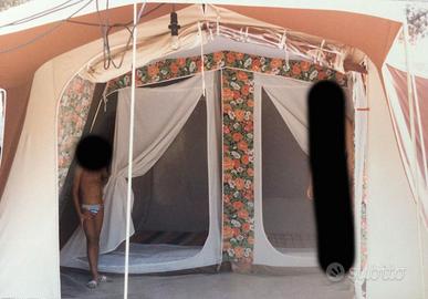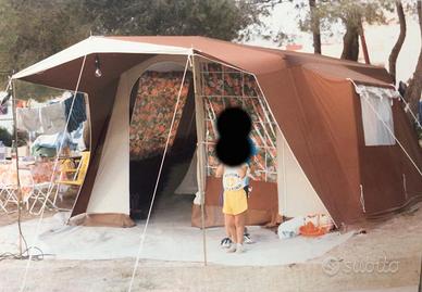 Tenda da campeggio a casetta in tela completa di due camere da letto, guardaroba con supporto appendi-abiti, angolo cucina con finestra per aerazione, soggiorno, sottotetto, tendine e veranda. Ha una armatura in acciaio cadmiato a giunzioni semiautomatiche tramite molle e catenelle di rapido montaggio. Ancoraggio al suolo mediante tensioni elastiche complete di picchetti e spilloni. Misure come da foto.