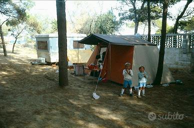 Vendo tenda da campeggio a casetta, marca Trigano, con 4 posti letto, in cotone pesante di colore arancio e marrone. Telaio a tubi in ferro zincato, estensibili a molla. Composta da: zona notte con due camere separate da telo, soggiorno con lucernario laterale. Misure: