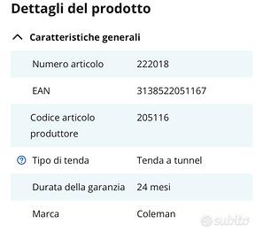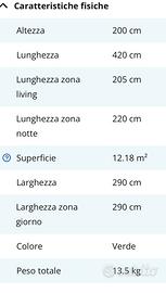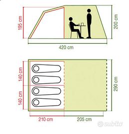 Tenda di ottima qualità, perfetta, usata 2 settimane. Vendo a malincuore per passaggio a roulotte. Due camere (volendo si possono unire) in cui entrano perfettamente due materassi da 135/140 cm. Zona giorno spaziosa e comoda. Pavimento a catino, ottimo quindi anche in caso di pioggia. Molto ariosa (usata d’estate nessun problema di caldo). Completa di lacci , tiranti e picchetti. Si monta velocemente : prima il tunnel e poi si aggancia il vano camere. Lavata e piegata e poi riposta nella sacca. Misure in foto. Materasso gonfiabile di 135 cm incluso.