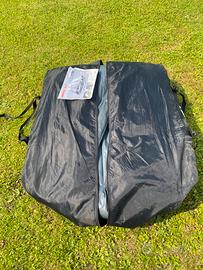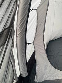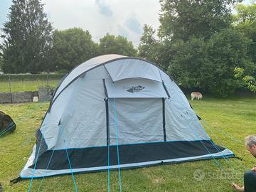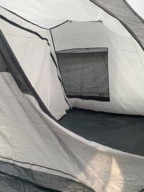 Tenda da campeggio 5 posti con fondo integrato, di facile installazione, ha tre archi gonfiabili che tirano su la tenda in pochi minuti, ampia veranda abitabile, due camere da letto, dimensioni cm 480x 350xH 190 nella veranda, H 170 Nelle Camere. In dotazione due gonfiabili di ricambio nuovi, Altissima impermeabilità anche con forte pioggia, usata pochissimo come nuova. Non effettuo spedizioni solo ritiro a mano.