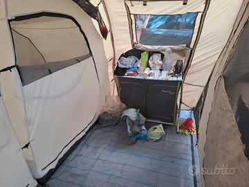 vendo tenda da campeggio usata solo 3 volte completo di tutti gli accessori frigo, tavolo, dispensa, cucina. pronta alluso . se non rispondo mandare un messaggio grazie.